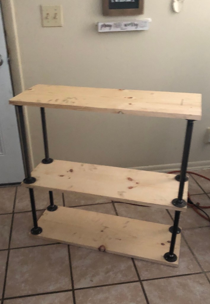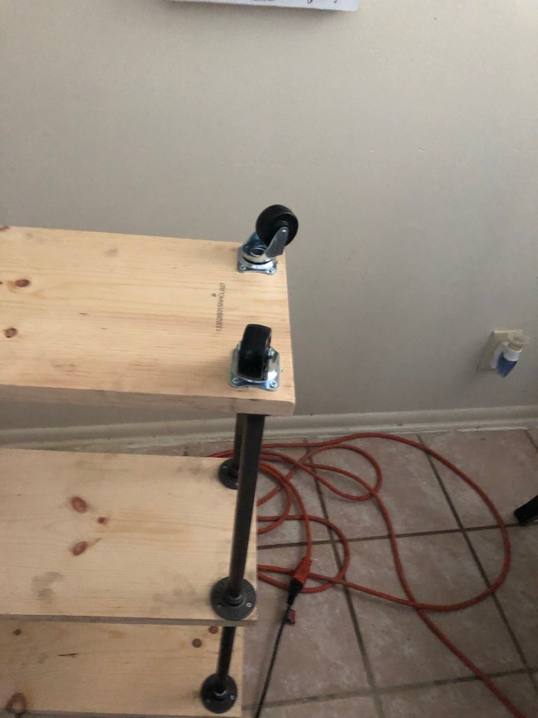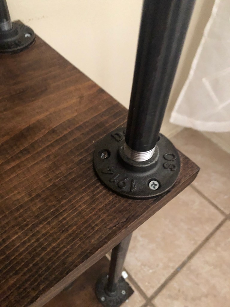 Screw in the first set of pipes. Take a step back and make sure you are okay. It’s better to make changes in this step than to disassemble a full cart. Here is where it starts to get tricky. When you are tighten pipes to another connection you are to be mindful of the twist direction. I learned the hard way when you are tighten one side you are simultaneously loosen the other (mind-blown). The work around is after you put the first set of pipes on go ahead and twist on four more flanges. Turn your first layer upside down to your second layer line up where you need to screw in those flanges. Make sure the cart is not gansta leaning by using your level. Screw the flanges to the second shelf.