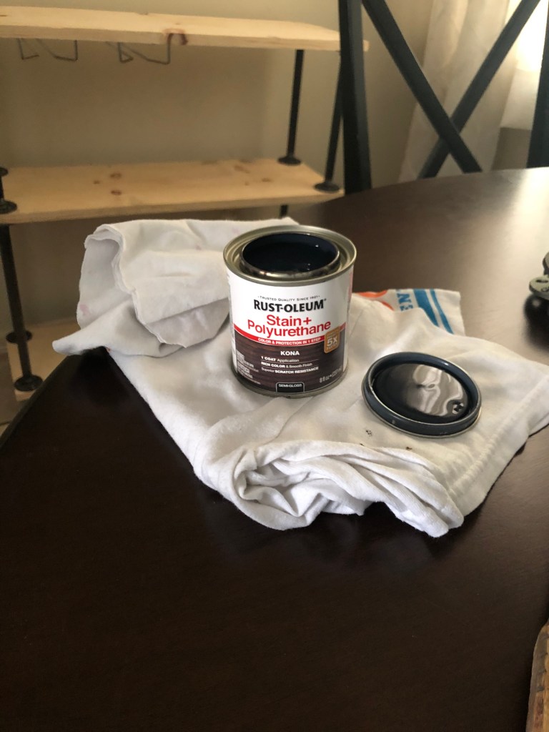 If you’ve ever purchase wood from a hardware store you know that wood can have bumps and bruises. Prep your wood by sanding any imperfections and the surfaces that you will stain. Please make sure when sanding wood you are in a well ventilated area and wear all protective gears! Step 3/4 can be done in reverse with Step 5 if you want even stain on the board. No one (except my sister) is going to look at the bottom of the shelf so I opted not to do it. I mean really why waste the time, sister.