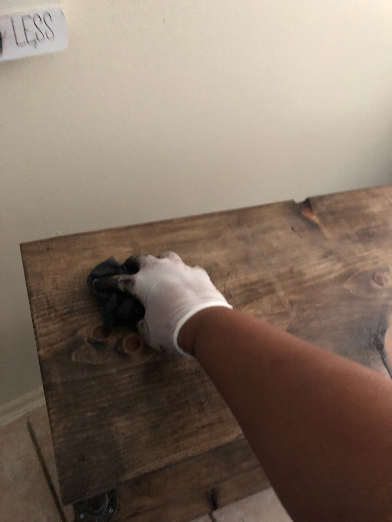 Prep your wood by making sure it is free of any debris or dust. Use a clean white shirt to apply the stain and wipe off any excess stain. Use protective gloves and protect any surface that you don’t want stain. I lived on the edge so I didn’t stain over a drop-cloth.