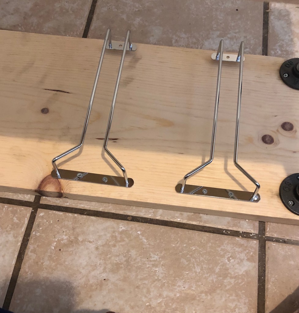 I ordered under cabinet wine racks to add to my cart. Flip the cart over and measure where you want the racks to hang. Mark holes for drill and screw rack to top board.